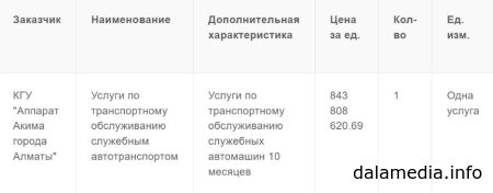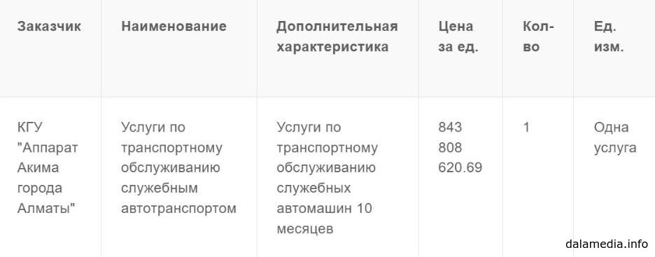 Так, на портале госзакупок аппарат акима города Алматы опубликовал тендер на «услуги по транспортному обслуживанию служебных автомашин» сроком на 10 месяцев. Обеспечение чиновников машинами на это время обойдется налогоплательщикам в весьма крупную сумму – почти 844 миллиона тенге.