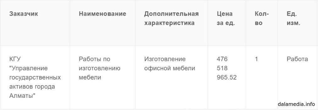 Если вы думали, что на этом роскошные закупки алматинских чиновников закончились, то вы ошибаетесь. На очереди – приобретение дорогостоящей мебели. Управление государственных активов города Алматы проводи тендер на «работы по изготовлению мебели», которые оценили почти в полмиллиарда тенге.